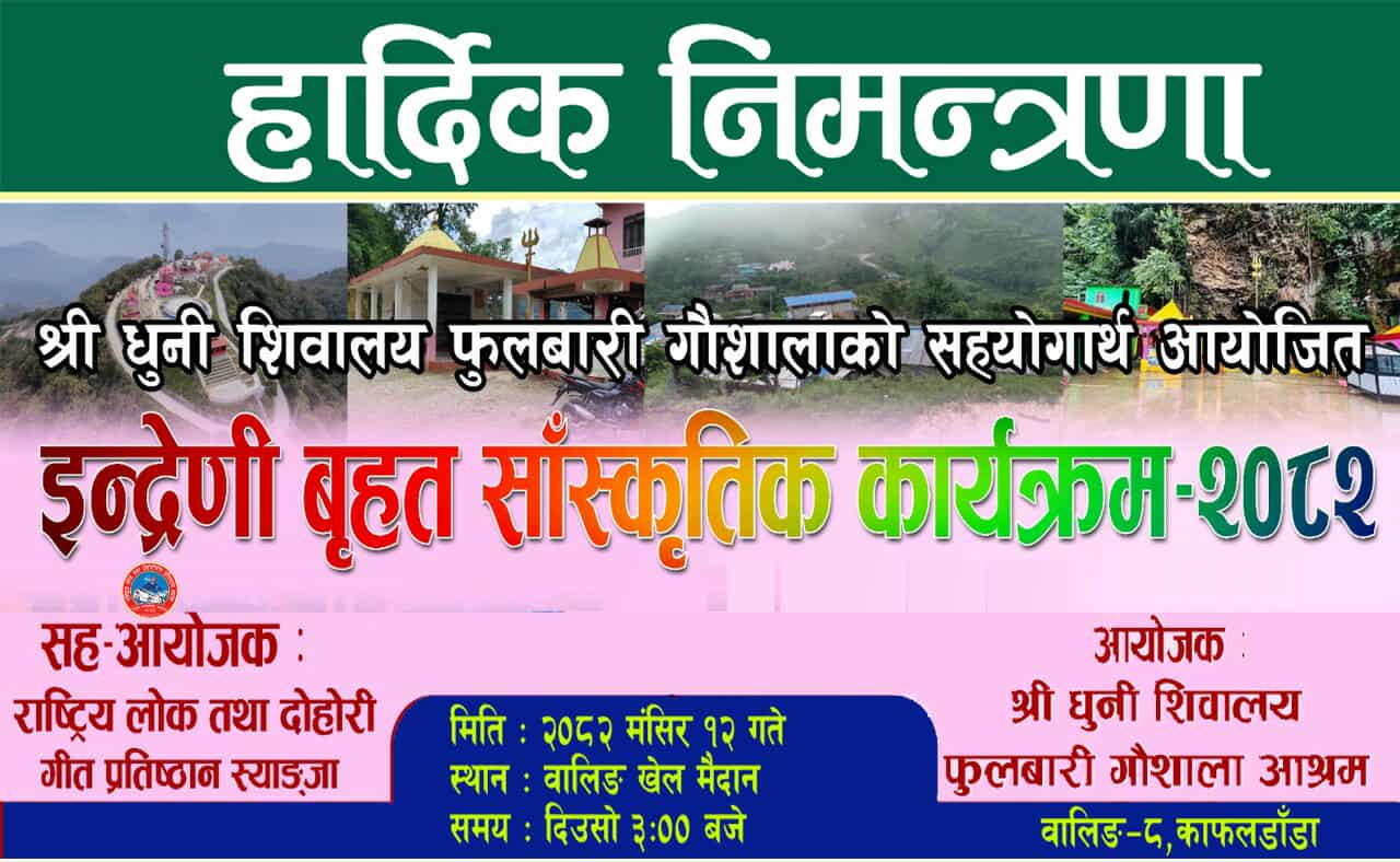श्री धुनी शिवालय फुलबारी गौशाला आश्रमको सहयोगार्थका लागि इन्द्रेणी बृहत् सांस्कृतिक कार्यक्रम हुने भएको छ