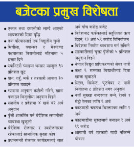 आयातमुखी अर्थतन्त्रलाई सुधार गरी उत्पादनमुखी र समाजवादउन्मुख बजेट ल्याएर अर्थमन्त्री शर्माले आफुलाइ अब्बल साबित गरेका छन् । बजेट ल्याउनुअघि कार्यकर्ता पोस्ने र चुनाव लक्षित हुने भनेर कलोकल्पित भ्रम छर्ने समुदायलाई गतिलो जवाफ दिने गरी अर्थमन्त्री शर्माले ‘जनता लोभ्याउने’ बजेट सार्वजनिक गरेका छन् । जसबाट आगामी आर्थिक बर्ष ८ प्रतिशतको आर्थिक वृद्धि हाँसिल हुने पर्याप्त आधार देखिएका छन् । बजेटले एकल तथा दम्पत्तीलाई लाग्दै आएको आयकरको सिमा वृद्धि, एक परिवारलाई एक विद्युतीय चुलो, मिर्गौला, क्यान्सर र मेरूदण्ड पक्षघातका बिरामीलाई महिनामा ५ हजार दिने, स्यानिटरी प्याडमा भन्सार महशुल ९० प्रतिशत छुट गर्ने, धान, गहुँ, मकै र तरकारी आयात ३० प्रतिशत घटाइनेलगायतका घोषणा गरेको छ ।