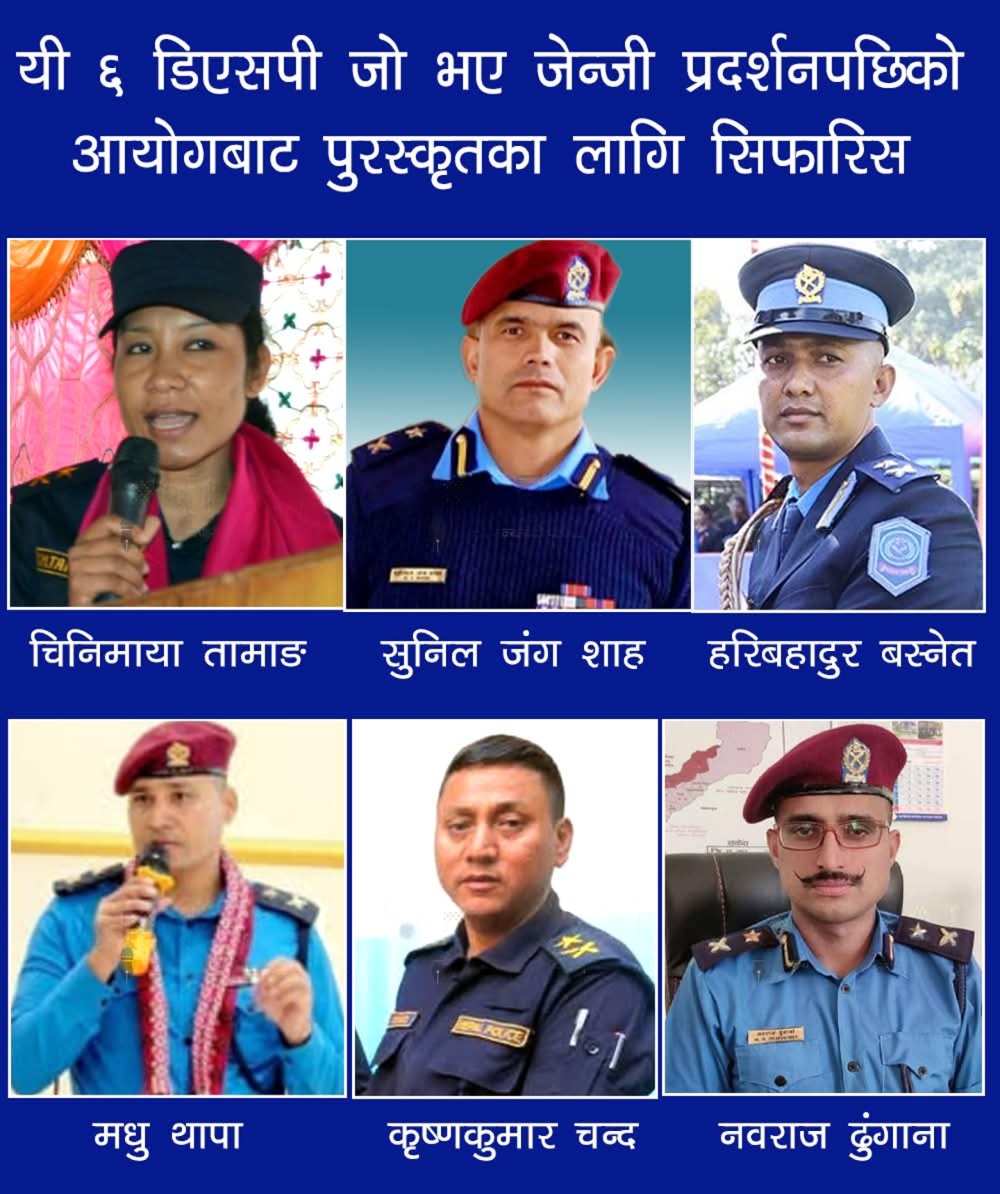 भदौ २३ र २४ को जेन्जी प्रदर्शनपछि गठित जाँचबुझ आयोगले नेपाल प्रहरीका ६ जना डिएसपीलाई पुरस्कृतका लागि सिफारिस गरेकाे छ । प्रदर्शनका क्रममा उनीहरुको कमाण्डमा