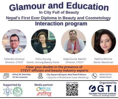सीटीईभीटीले नेपालमै पहिलोपटक पोखरामा व्युटी तथा कस्मेटोलोजी कार्यक्रम संचालन गर्ने भएको छ । तीन वर्षे डिप्लोमा उक्त कार्यक्रम संचालन हुने भएको हो । सोही विषयमा