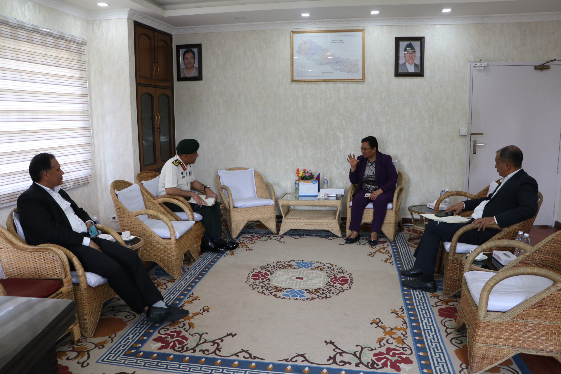 ऊर्जा, जलस्रोत तथा सिँचाइमन्त्री पम्फा भुसालसँग नेपाली सेनाका प्रधान सेनापति महारथी प्रभुराम शर्माले आज भेटवार्ता गरेका छन् । मन्त्रालयमा भएको भेटवार्तामा उनीहरुबीच जलविद्युतको विकास तथा