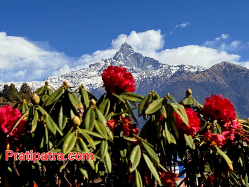 ढ्क्कमक फुलेका लालिगुराँस र आँखैमा ठोकिने हिमाल ल्वाङ गाउँबाट यतिबेला रोमाञ्चक देखिन्छ । कास्कीको माछापुच्छ्रे गाउँपालिका–८ ल्वाङको चियाबारीको मम्मुख मै माछापुच्छ्रे देखिन्छ । चियाबारीबाट देखिएको
