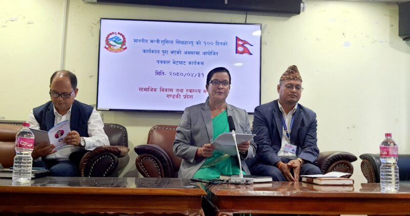 गण्डकी प्रदेशका सामाजिक विकास तथा स्वास्थ्य मन्त्री सुशीला सिम्खडाले आफ्नो सय दिनको मुख्य मुख्य उपलब्धि सार्वजानिक गरेकी छन् । बुधबार पत्रकारसंग भेटघाट गर्दै उनले आफ्नो