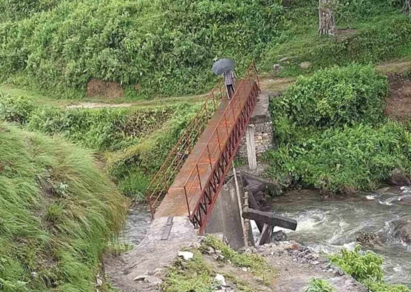 भत्किएको पुल । जहाँ आधा भाग खोलामा खसेको छ । पुलको सल्याबमाथि राखिएको बाँस र काठमा टेकेर स्थानीयबासी जोखिमपूर्ण यात्रा गर्न बाध्य छन् । बर्खायाममा